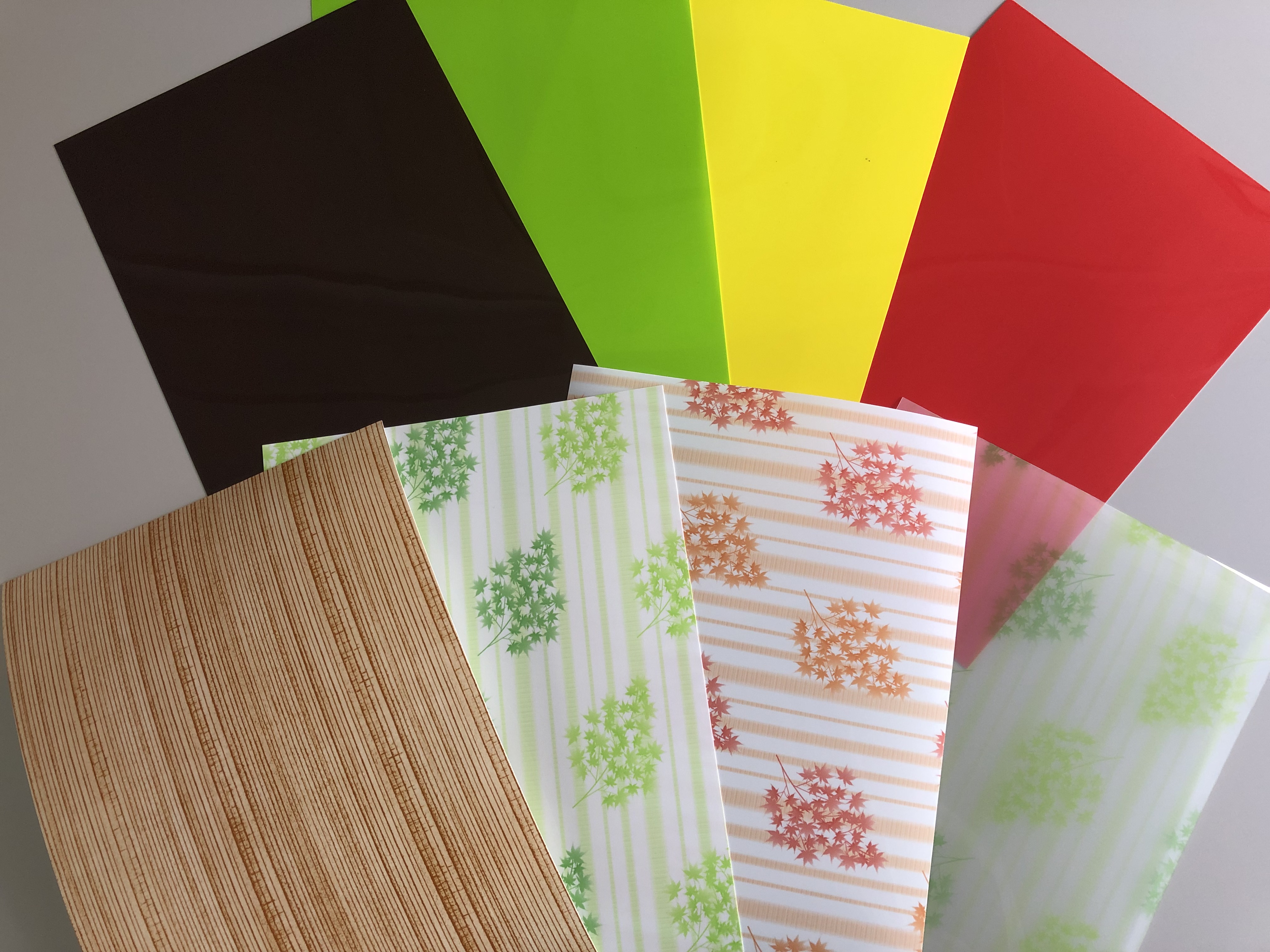 色物・柄物のフィルムとPPシートを貼りあわせて製造いたします。